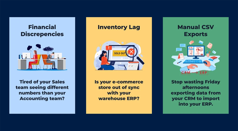 Many businesses struggle to integrate their ERP, CRM, eCommerce (Shopify), and accounting software, resulting in: